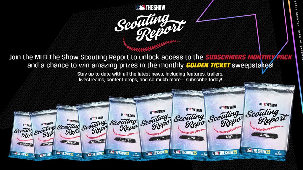 For all the fans, make sure to sign up for the MLB The Show Scouting Report to stay updated on all the latest features, updates, and legends coming to MLB The Show 25, while unlocking amazing rewards along the way. Starting in April 2025, subscribers will receive a unique pack every month through December 2025*, packed with incredible in-game rewards. Plus, the Golden Ticket Sweepstakes will return in 2025, with winners selected every month for amazing prizes like Packs, Stubs, clothing, autographed items from Elly De La Cruz, Gunnar Henderson, and Paul Skenes, along with even more surprises we can’t wait to reveal. Don’t miss out—sign up today on theshow.com!